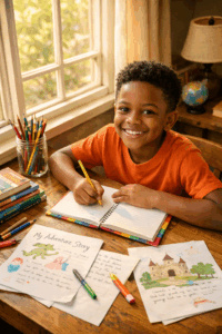 Happy boy writing